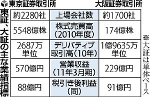 統合交渉を進めていた東京証券取引所と大阪証券取引所が、東証が株式公開買い付け(TOB)で大証を子会社化する方向で大筋合意したことが12日、明らかになった。